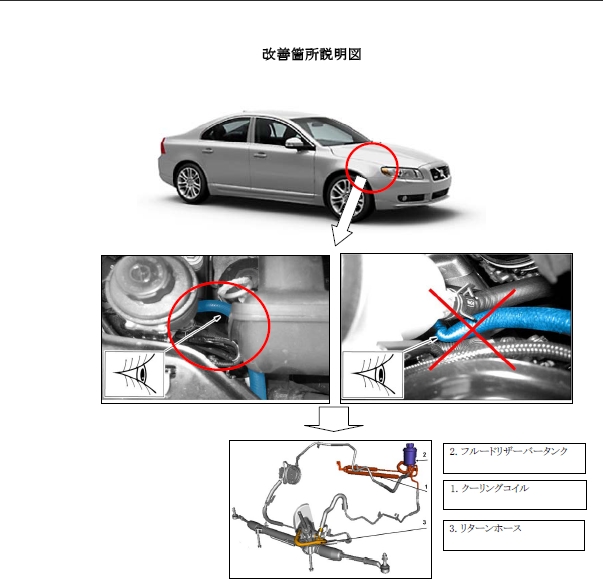 ① パワーステアリング油圧配管において、ホースの取り回しが不適切な場合があり、配管内の油圧が高まることで、リターンホースが損傷する場合がある。