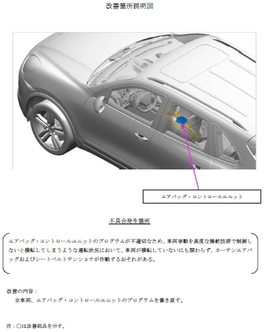 エアバッグ・コントロールユニットのプログラムが不適切なため、車両挙動を高度な操舵技術で制御しないと横転してしまうような運転状況において、車両が横転していないにも関わらず、カーテンエアバッグおよびシートベルトテンショナが作動するおそれがある。