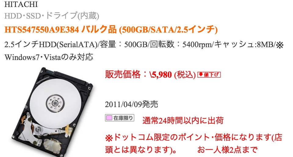 ソフマップ.comで、HITACHI製の2.5インチ 500GBを注文!